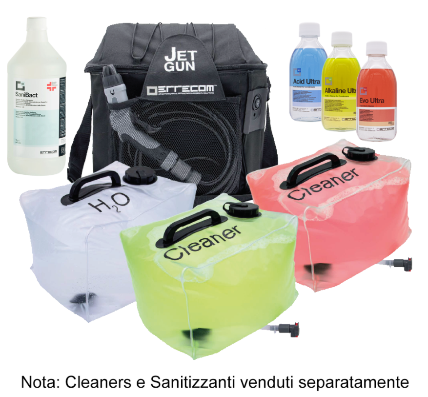 Use SaniGun with Sanibact concentrated disinfectant; just 180 ml of Sanibact diluted in water 1:25 will allow you to fill the JetGun bag with 9 liters of ready-to-use disinfectant.